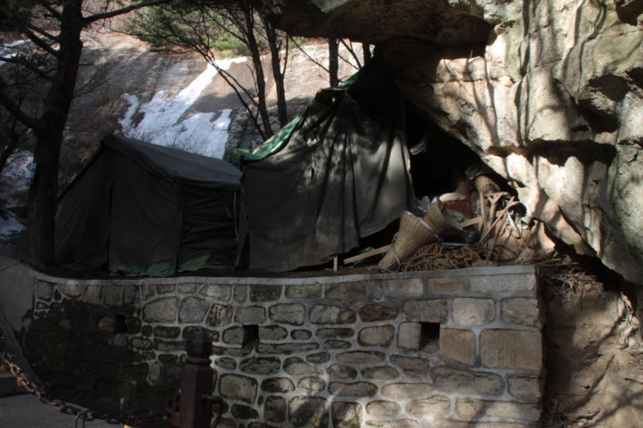 Quando entrei na tenda, estava um radiador em forma de parabólica ligado e dois homens descalços a aquecer os pés. O meu anfitrião pronunciou algumas palavras para os restantes e entretanto apontaram-me um lugar para me sentar e pousar a mochila, enquanto vários pares de olhos me olhavam com curiosidade. Dentro da tenda o espaço era rectangular e alto, a temperatura era agradável (fruto do radiador e do calor humano) e havia algum fumo. Para além disso, fora construída uma plataforma elevada em madeira e contraplacados em forma de U invertido que servia para manter as pessoas afastadas do solo enlameado e gelado. Esta plataforma estava cheia de edredons, sacos de viagem, ferramentas e pessoas sentadas ou deitadas a esfumaçar, a jogar às cartas ou pura e simplesmente silenciosas. Existia ainda, nesta plataforma uma subdivisão feita com outros painéis e panos de tenda, tal e qual uma segunda mini tenda.