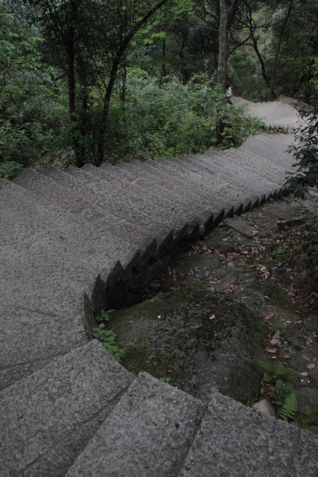 Quando comprei o bilhete (aproximadamente 29€!) referi que queria voltar no dia seguinte e recebi uma declaração para o devido efeito, deste modo o bilhete teve a validade de dois dias e não de apenas um como é normal – claro que isto não está escrito em lado nenhum e apenas soube deste “detalhe” graças à rececionista do meu hostel! 🙂 Às 8.10 comecei a ascensão da montanha Amarela e se inicialmente o dia estava bastante pardacento, a verdade é que à medida que o tempo passou, o dia foi-se tornando mais claro, o céu “azulou” e o sol despontou. 🙂 À medida que fui subindo degraus parecia que estava numa mistura de Huashan – faces escarpadas – e de Emeishan – verde, verde… verde – e a primeira parte da ascensão até Groting Guests Pine foi bastante rápida – aproximadamente duas horas. Por esta altura, a ascensão não estava ter a dificuldade que esperava, mas fruto da beleza da montanha, a experiência estava a ser muito boa.