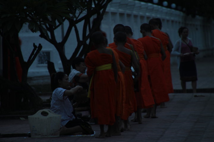No nosso primeiro dia inteiro em Luang Prabang, acordámos às quatro da manhã para ir ver os monges no seu ritual diário, de pedir comida. Porém ao sairmos da guesthouse não se via ninguém nas ruas, a não ser uns vendedores ambulantes que estavam a montar os seus estaminés e aos quais perguntei a que horas começava o ritual. Fomos então informados que apenas começava às 5.45 e como tínhamos muito tempo, percorremos a cidade deserta com o objetivo de escolher um bom local. Em frente ao Wat May, sentámo-nos num banco e ficámos a aguardar.