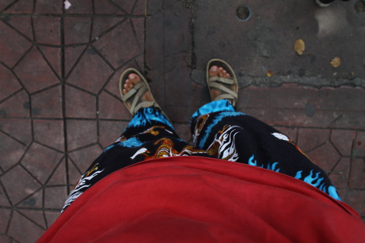 Na cidade visitámos bastantes templos, mas os destaques principais vão para: o Wat Pho, templo onde “nasceram” as famosas massagens tailandesas e casa de um Buda gigantesco – em posição deitada – que tem a planta dos pés enfeitadas com detalhes madrepérola! Espetacular; o Wat Arun – templo do amanhecer – na margem Este do rio e onde existem estupas de inclinações absolutamente vertiginosas e temos a sensação de cair a pique! e o Wat Phra Kaew – templos no complexo do Grande Palácio. Antes de entrar e como estava de calções, tive que alugar umas calças e em rifa calharam-me umas “belas” calças tipo aladino que os ocidentais veneram quando chegam à Ásia. 😛 Depois da visita, fiquei com opinião que este é o templo mais impressionante de Bangkok e de todo o país. Monumental! 😀 E onde a riqueza é tão imensa e tão concentrada que chega a ser “sufocante”. Parece que o mesmo não nos dá um segundo de “sossego” para apreciar os detalhes seguintes, pois existe um estímulo visual constante e incessante – foi como sentir que estava a beber vinhos excecionais, uns a seguir aos outros mas de “penalty” e por isso os mesmos, não tinham tempo para respirar.