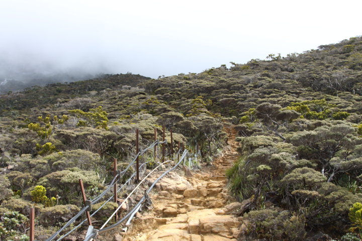 O início do trilho realizou-se no meio de uma floresta tropical muito verde, que a partir do quarto/quinto quilómetro desapareceu totalmente e o caminho seguiu no meio de rocha amarelada/alaranjada pontuada aqui e acolá por arbustos. Em duas horas chegámos a Laban Rata – quilómetro seis – bem dentro da barreira temporal definida pelo parque, porém enquanto aguardava pela decisão do ranger – o responsável que define se existem condições de segurança – senti progressivamente um nervoso miudinho, uma vez que existia um nevoeiro que nos envolvia. Felizmente recebemos a confirmação que podíamos continuar a ascensão 🙂 e quando atingimos o sétimo quilómetro, a montanha…
