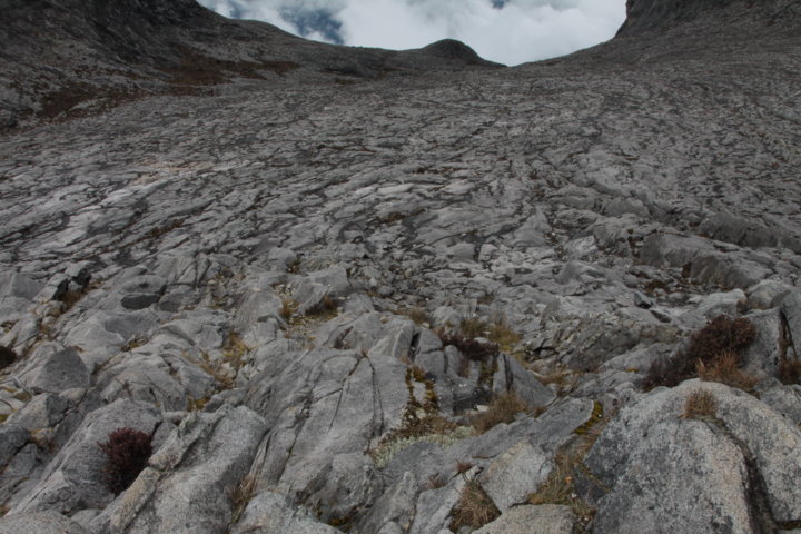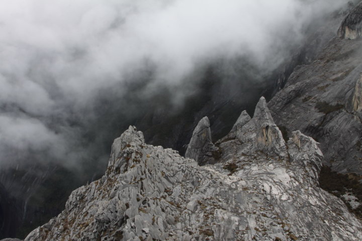 Transformou-se! A vegetação extinguiu-se quase na totalidade, as faces ficaram mais escarpadas e a rocha adquiriu uma cor metalizada e brilhante. Até começámos a ter direito a uma corda para nos auxiliar na ascensão das zonas mais inclinadas e escorregadias. Passo a passo fomos subindo e em nosso redor apenas víamos rocha em todas as direções. Em certo momento, a visibilidade aumentou progressivamente e comecei realmente a ver os diferentes picos de Kinabalu à nossa volta (St. Jonh´s Peak – 4091 m; Donkey Ears Peak – 4054 m; Ugly Sister Peak – 4032 m).