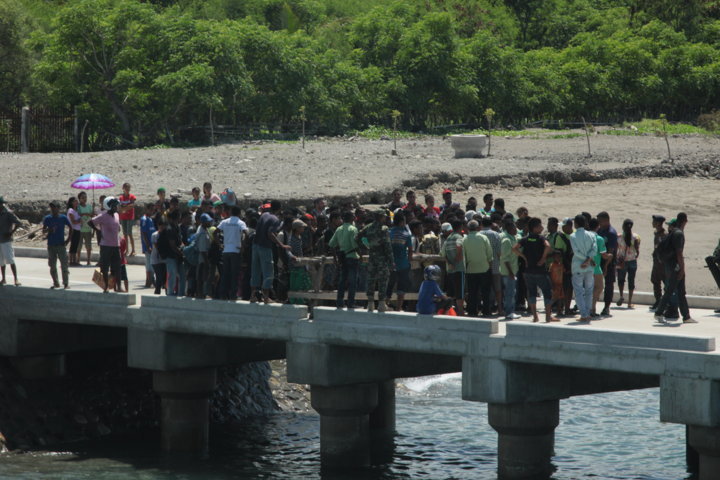 De manhã acordei às 4.30 para comprar o bilhete de barco para Dili no porto. Depois duma curta boleia, numa carrinha de pedreiros e serventes, e assim que cheguei ao destino, deitei-me em frente da bilheteira no chão, onde dormi durante cerca de uma hora na companhia de outros vultos noturnos. Assim que o dia começou a clarear, as pessoas começaram a despertar e eu sentado aguardei, aguardei, até que…. perto das 7.00 se começaram a vender os bilhetes. A fila que parecia estar criada desapareceu, gerou-se um enorme caos – empurrões, safanões, apertos – e senti que estava no meio de animais a lutarem pela sobrevivência! No meio desse estrafego, conheci Garey – um estudante de Dili – e combinámos que quem chegasse primeiro ao guichet compraria o bilhete do outro. Depois de uma hora de “luta” e já depois de entregarmos o dinheiro e os documentos de identificação, os “diligentes” funcionários chamaram-nos para nos entregarem os bilhetes num guichet lateral.