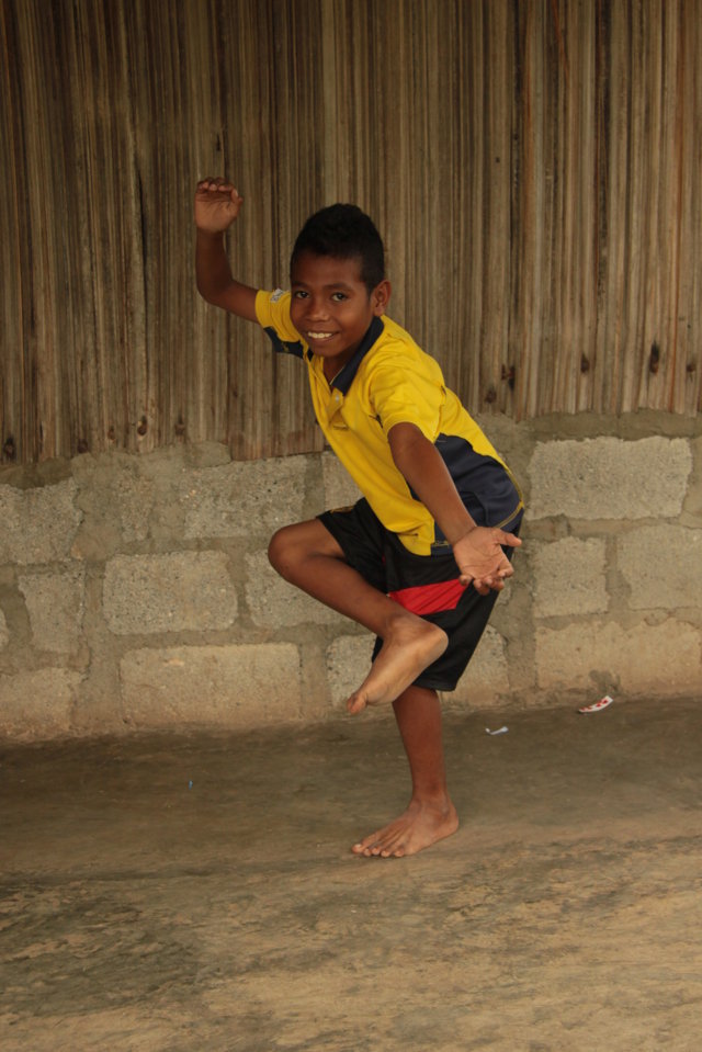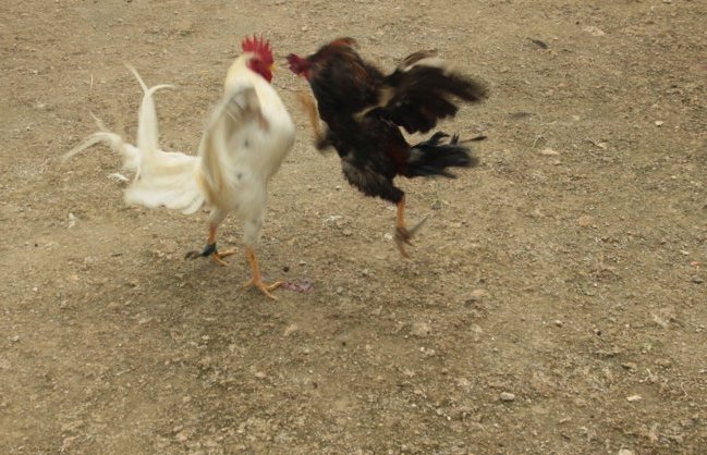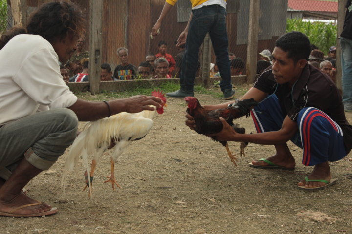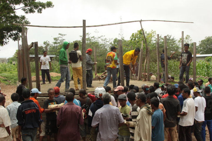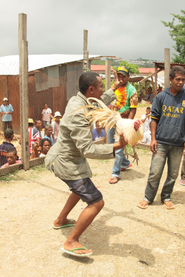 No dia seguinte, depois do pesado pequeno-almoço – folhas de papaia com arroz – e de nos despedirmos dos pais de Gregório e de Cirilo, voltámos ao centro de Baucau onde continuei a visitar a família Nicolau 🙂 e tive a oportunidade de ver as tradicionais e sangrentas lutas de galos. Em Timor Leste, estas lutas estão profundamente enraizadas na cultura do país e no mercado da cidade, vi a “loucura” que envolve esta tradição. A multidão frenética, o ruído, as apostas, as regras dos combates – vitória em caso de morte ou fuga -, os prémios – dinheiro e galo do perdedor, vivo ou morto -, a arena, os galos garbosos, as lâminas afiadíssimas presas nas patas, a “dança” mortal, os golpes na carne, o sangue espesso, os olhos dos animais no seu último fôlego e a morte a reclamar a vida dos vencidos…