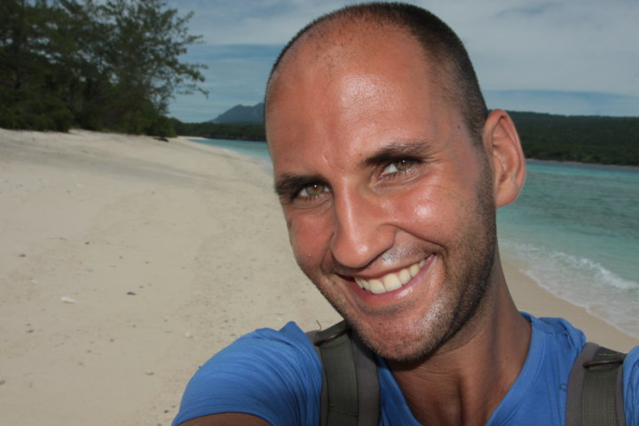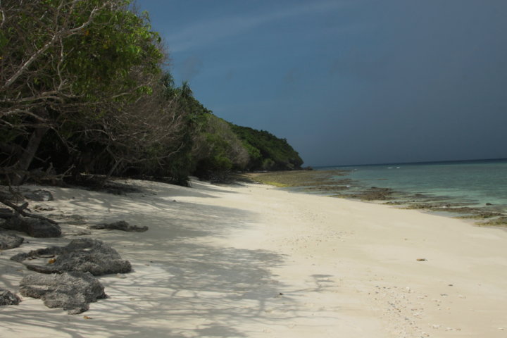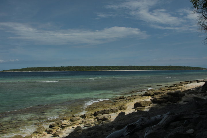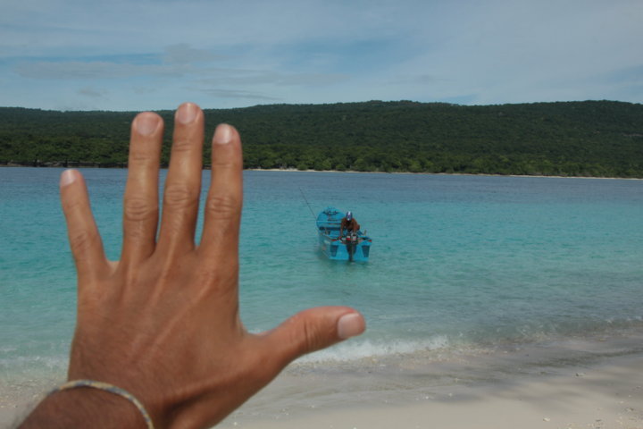 Depois de me despedir, a primeira visão que tive foi MÁGICA! 😀 Virado de frente para a costa este de Timor Leste, vi montanhas a sul, a linha do horizonte coberta de verde – um oceano de árvores e vegetação em todas as direções -, um mar de infinitos azuis, verdes – lindo, lindo, lindo! – e tive contacto com uma areia branca finíssima que em alguns locais parecia pó – nesta altura lembrei-me de Maya beach na Tailândia e do tour que fizera há uns meses nas ilhas Phi Phi. Estava num local de beleza natural virgem e um deserto absoluto! Cheirava a mar… era a única pessoa na ilha… o rei do ilhéu! 😀