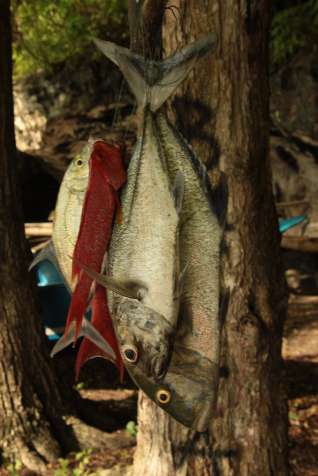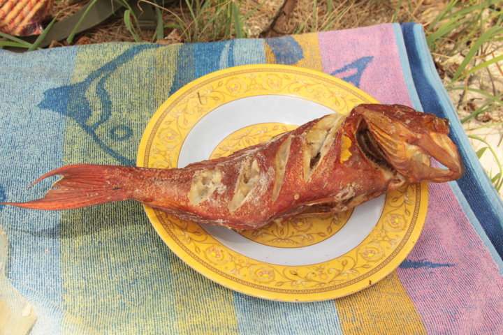 Na hora do almoço, cheguei a pensar se o pescador se teria esquecido de mim e pensei que ficar no ilhéu só com água e bolachas, apesar do local ser um paraíso não teria muita graça… e a verdade é que o almoço chegou via marítima – um peixe inteiro, grelhado apenas com sal. A deliciosa simplicidade, servida numa praia de uma beleza comovente! 😀
