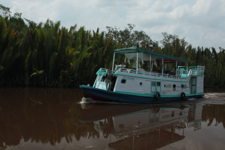 Durante a viagem, vimos palmeira e outros tipos de vegetação semi submersa, pequenos barcos de transporte de mercadorias, de pescadores, barcos turísticos de médio porte (como o nosso), muitas espécies de pássaros, alguns macacos probuscius e dois orangotangos muito disfarçados no meio da folhagem 🙂 ; recebemos um briefing do nosso guia (Mr. Supian Hadi, ou simplificando Mr. Uzo) e ficámos a perceber o plano de “festas” para os próximos dias; deliciámo-nos ao almoço (arroz + tempe + vegetais + peixe); e comecei a perceber que o dinheiro investido iria trazer bastantes regalias! 😀 (tripulação: mecânico, capitão, cozinheira e guia).