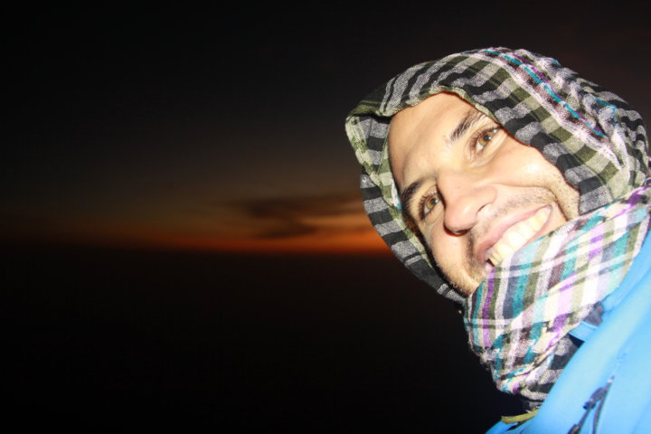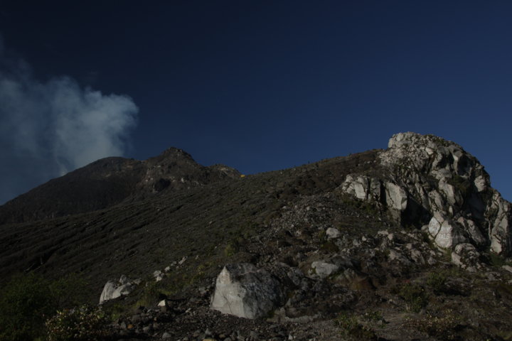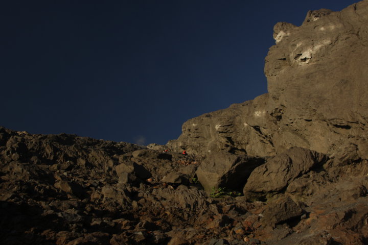 A ascensão foi quase sempre feita em rampas muito inclinadas e existiram poucos momentos, em que o vulcão nos deu tréguas! Fruto disso, o Zhang ficou para trás com o nosso guia e eu segui com um casal de americanos e o guia deles. Para chegar ao pico não foram necessárias muitas horas, mas foi preciso alguma estamina e endurance, principalmente depois de chegarmos ao último posto de controlo de atividade vulcânica e na zona em que a ascensão é feita numa rampa hiper inclinada de areia muito densa, pesada e escorregadia (dois passos para a frente e um para trás). Nessa altura, cheguei a pensar se iria conseguir chegar ao topo, mas passo a passo, lá fui avançando até chegarmos a uma zona de rocha firme, onde o caminho se tornou mais acessível. 🙂 Durante a ascensão até ao pico apenas existiram dois pequenos percalços, o primeiro quando o nosso guia nos tentou sacar mais dinheiro, dizendo que se quiséssemos chegar ao cume teríamos de pagar mais 100.000 IDR cada um, ao que respondi prontamente: “Nem pensar! O dinheiro que pagámos foi para chegar ao pico! E tu vais-nos lá levar, porque é essa a tua obrigação!” e o segundo quando quase no pico fiquei sem luz – a pilha da lanterna, esgotou-se – e tive que fazer o resto da ascensão meio às “apalpadelas”.