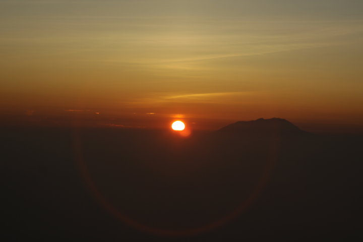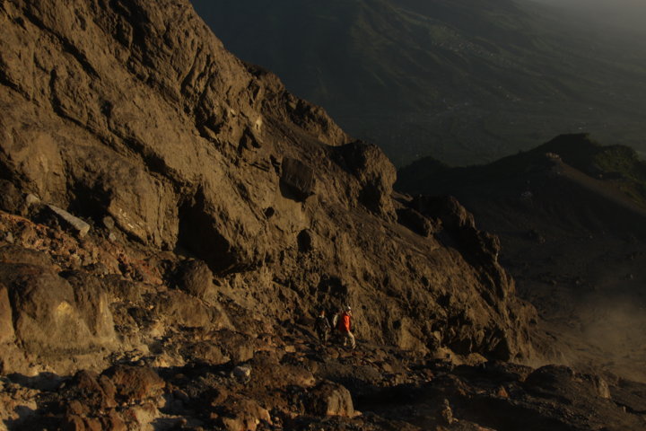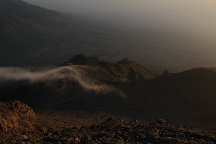 Quando atingimos a zona da cratera eram quase 5.00, e se durante a noite apenas se via o que a lua e as estrelas iluminavam, à medida que os minutos foram passando e o dia vencendo a noite, começámos a ver a plenitude do local. E o mesmo era belo! Muito belo! A cratera, com os seu fumos que corriam no céu azul e se fundiam com algumas das nuvens existentes, as nuvens cheias de cor e densidade – existia uma que se assemelhava a uma explosão atómica, tal a sua densidade – o sol a despontar e banhar a face nascente (onde nos encontrávamos) de dourado, e com isso o castanho e o negro das rochas destacaram-se, os verdes nos vales em nosso redor, a grandiosidade da montanha Merbabu, à nossa frente! Espetacular! E tal como no Rinjani, fiquei com a certeza que adoro vulcões e as suas belas paisagens naturais. 😀
