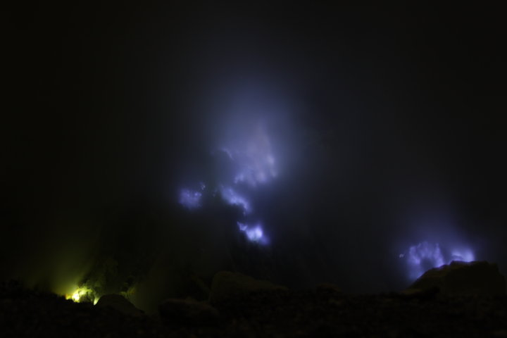 À 1.00, já com as mochilas no carro partimos para o Ijen, onde conhecemos Mr. Bain que ao longo da noite, revelou ser um dos melhores guias que tive no país! E possivelmente em toda a viagem! 😀 Os três quilómetros, a subir até à cratera foram feitos em ritmo Plan Plan (devagar) e até esse momento, pouco ou nada há que relatar. Porém, quando chegámos à cratera tudo mudou e do local onde nos encontrávamos víamos ao longe um fogo azul bruxuleante, fruto da extração do enxofre! Entusiasmados, seguimos o Mr. Bain, cratera abaixo e nessa altura recebemos máscaras, do género “Darth Vader” para suportarmos o fumo e os gases tóxicos – caso fosse necessário. À medida que nos fomos aproximando, fomos vendo as chamas cada vez maiores e quando chegámos às proximidades, vi algo único e singular à minha frente. Fogo azul, no meio da escuridão a arder! Espetacular! Belo! Na altura, em que observávamos aquele “fogo de artifício” natural, tivemos bastante sorte pois o vento estava a soprar o fumo noutra direção, ou será que não foi sorte, mas antes um feitiço do Mr. Bain, o feiticeiro branco do Ijen!? 🙂