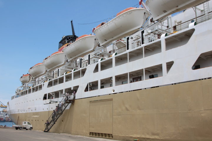Às 5.30 já estava na zona do porto e durante horas fui escrevendo no caderno até embarcar às 11.30, sendo o único momento de pausa, a compra de mantimentos (água, bolachas e tabaco). O barco era gigantesco e inicialmente não consegui perceber onde era o meu poiso, pois andava à procura de um camarote de segunda classe, quando afinal o que tinha era um bilhete para a classe económica! Como não era isso que esperava, fiquei chocado com a “suite” que encontrei – uma cama nas profundezas do navio – e depois de largar a bagagem, pus-me a mexer daquele cafunfo quente e escuro!