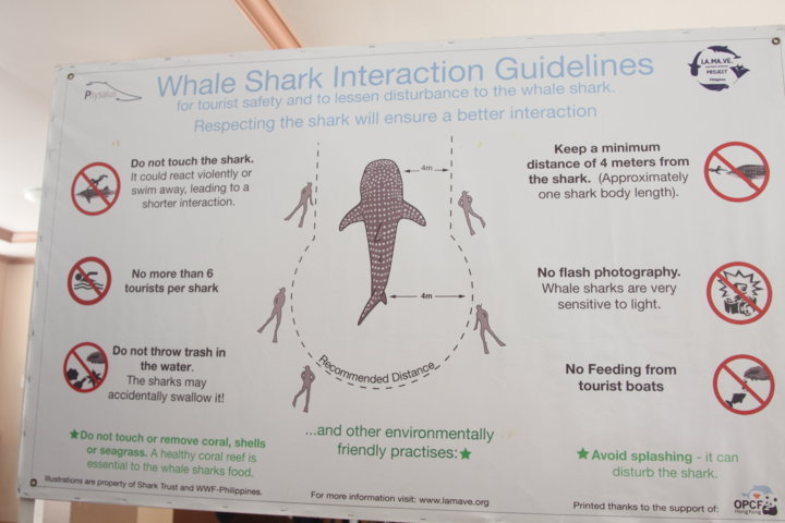O ambiente geral de azáfama e ruidoso não foi uma novidade para mim… já sabia ao que ia e desse modo foi fácil meter um chip e transformar-me num “robot”. Com o chip colocado recebi um briefing, apanhei a banca designada e saltei para dentro de água. Durante meia hora, andei para trás e para a frente, tentando ora aproximar-me, ora manter-me a uma distância que me parecia segura, pois muitas vezes aqueles dóceis gigantes aproximavam-se demasiado. Apesar da quantidade de pessoas existentes e do “processo” dos barqueiros mandarem comida para dentro de água não me agradar, no momento em que comecei a ver os tubarões baleia “desliguei-me” do ambiente geral e foquei-me na extraordinária beleza deste animal (na sua boca oval aberta qual aspirador gigante, nos padrões da sua pele malhada, na sua enorme envergadura, na suas guelras, na sua barbatana caudal…). Espetacular! Inesquecível! 😀 E o único senão foi ver o Francis cansado e ofegante, agarrado a umas cordas/bóia a descansar. Assim que o tempo acabou, regressámos à banca e rumámos a terra.