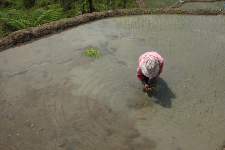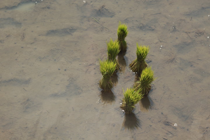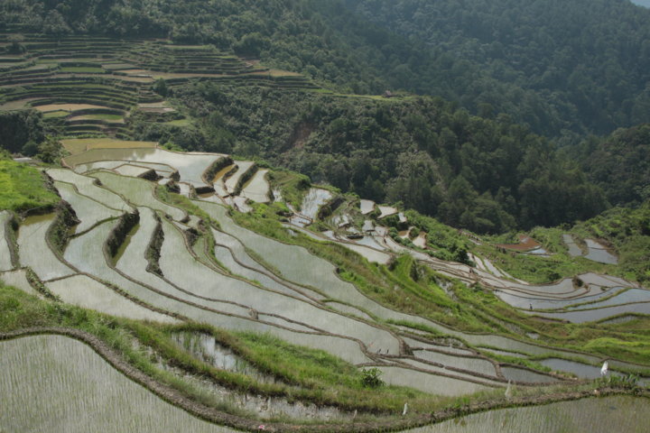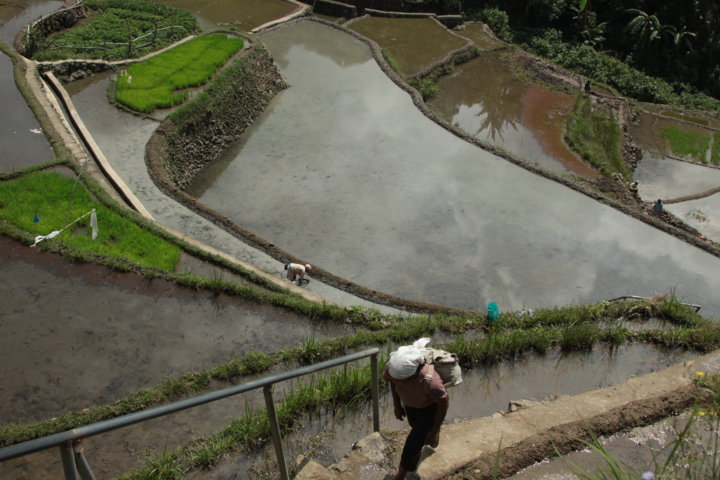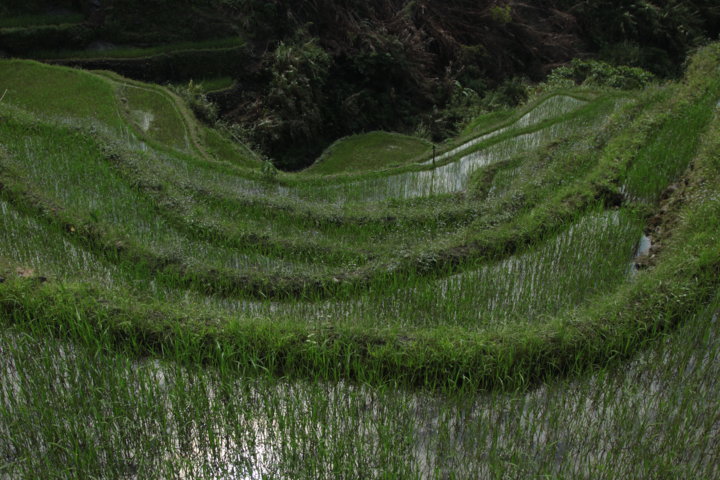 Nessa aldeia, estive toda a manhã em deambulações e aí tive a oportunidade de observar pela primeira vez, e verdadeiramente uns terraços de arroz made in Filipinas. 🙂 Aqui encontrei terraços muito verdes e simultaneamente, cheios de água e reflexos. A paisagem era muito tranquila, serena e bonita, e para além de mim, só se viam camponeses nos seus afazeres: cortar erva, reconstruir terraços com lama, plantar arroz..