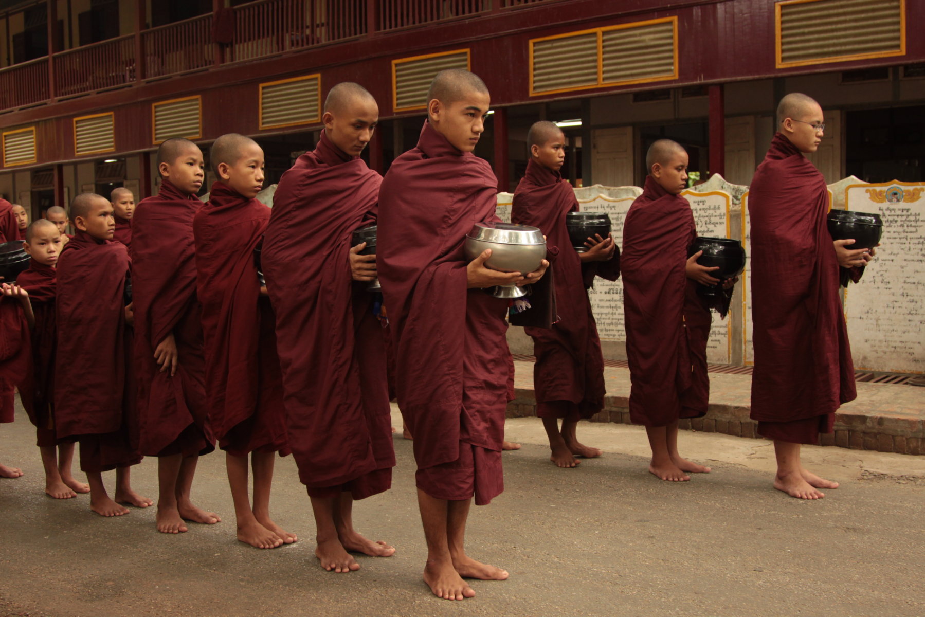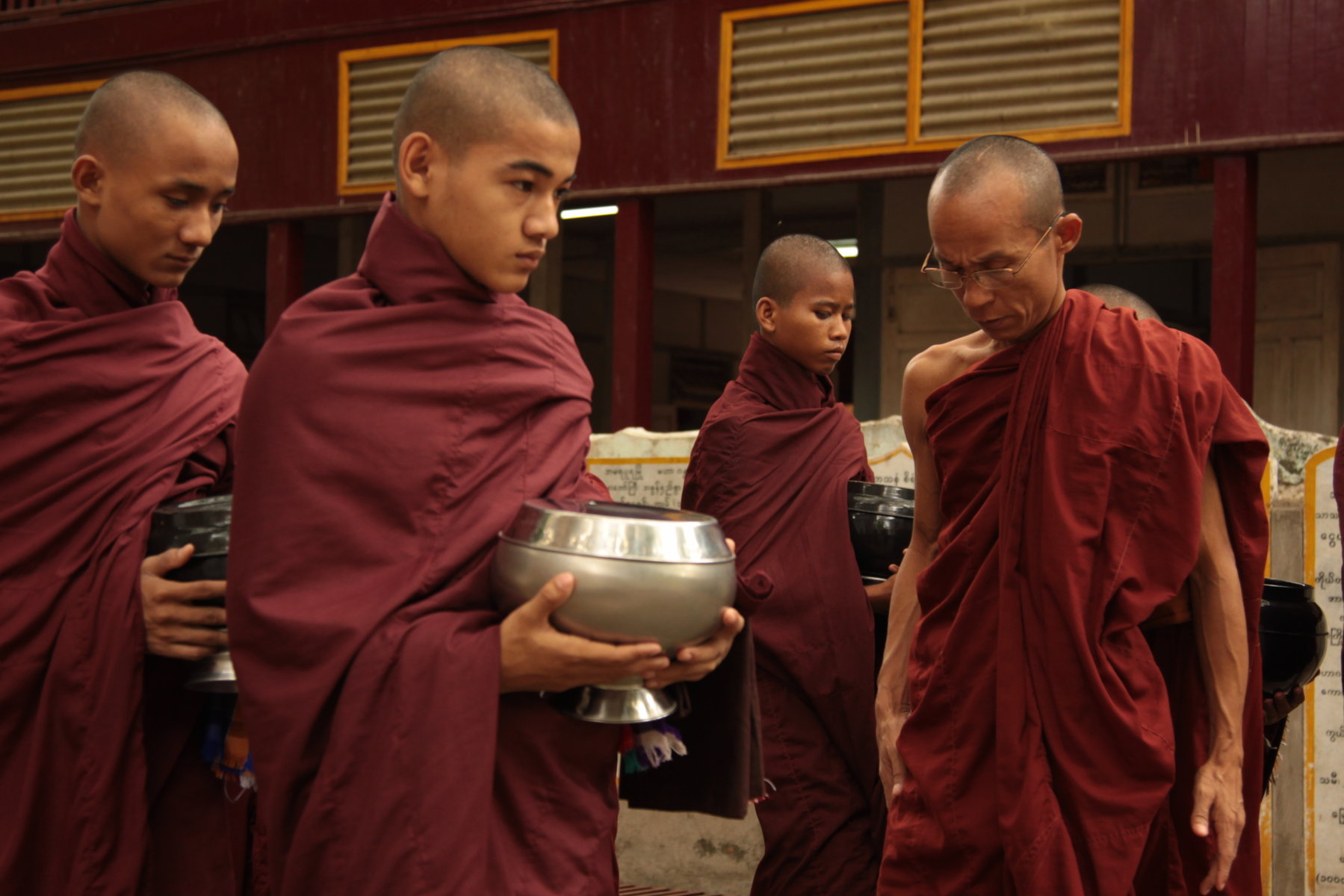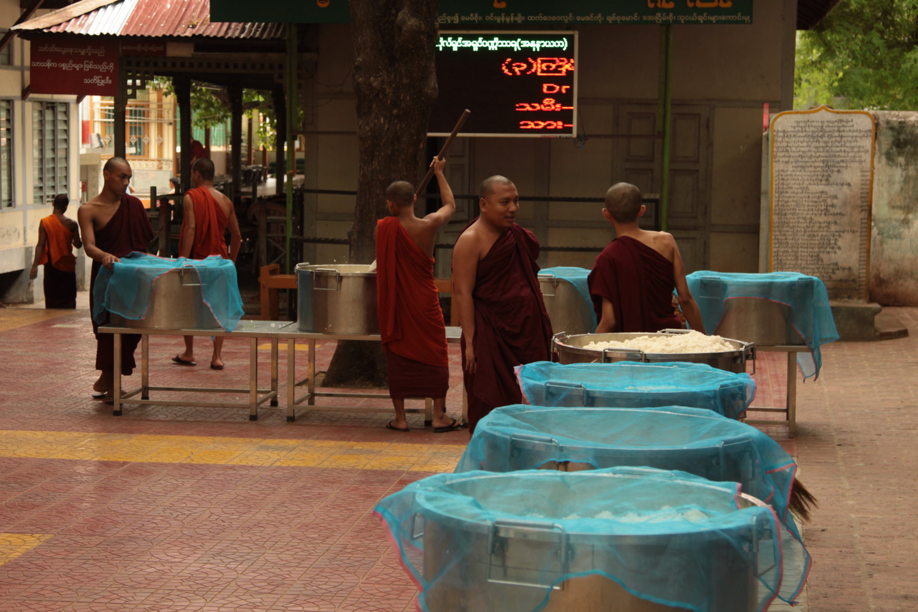 Depois da visita à interessante cidade de Mandalay, havia que visitar os seus arredores, uma vez que estes estão repletos de locais de interesse histórico e cultural. Tal como previamente combinado, o taxista apareceu à hora marcada e juntamente com as raparigas parti de espírito animado. A nossa primeira paragem ocorreu em Amarapura, onde encontrámos centenas de monges em fila para almoçar. A disciplina, os rostos sóbrios, serenos e sorridentes (dos mais jovens), os pés a caminhar, as vestes bordô, os turistas a tirar fotografias. Foi sem dúvida, um ritual interessante de observar. 🙂