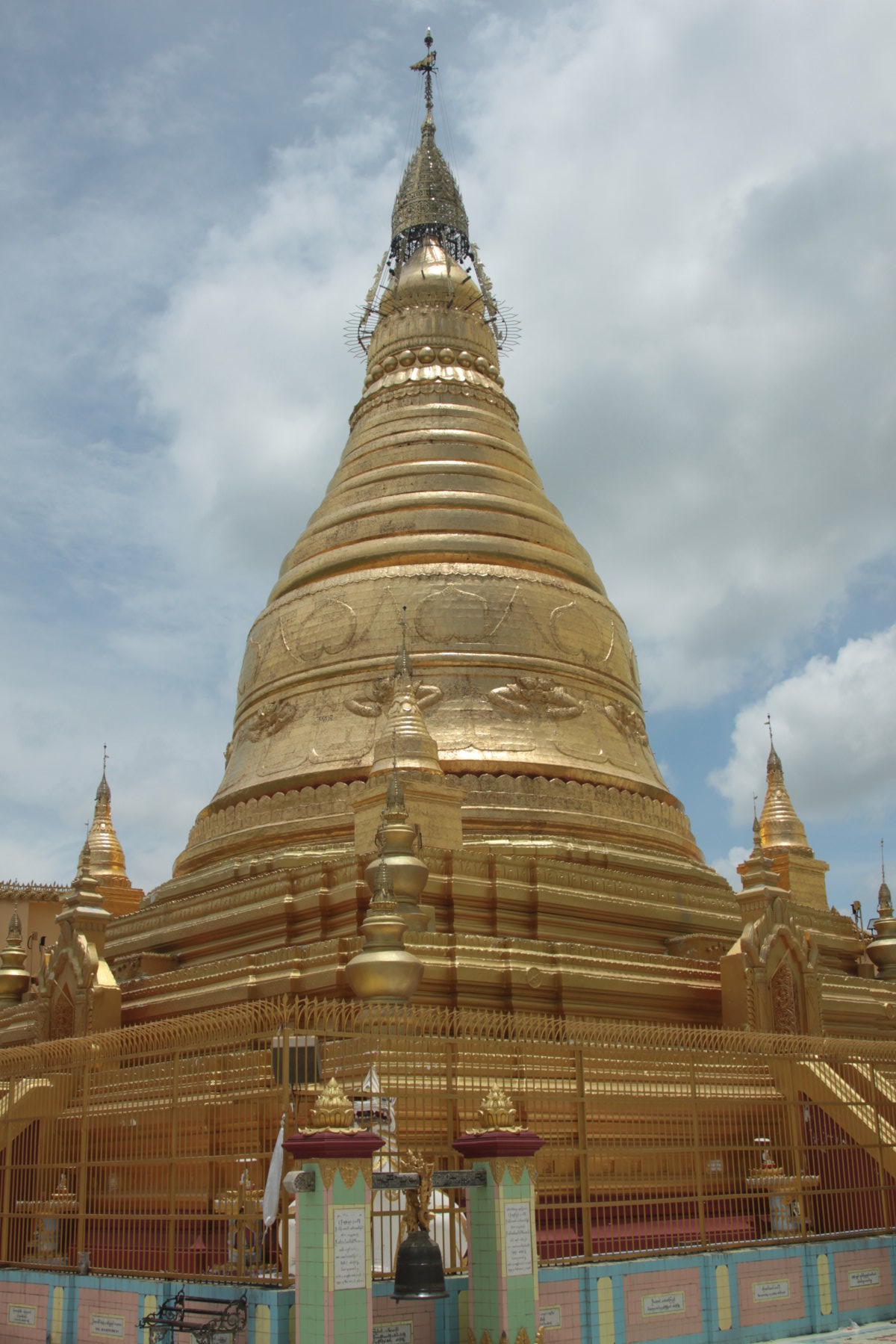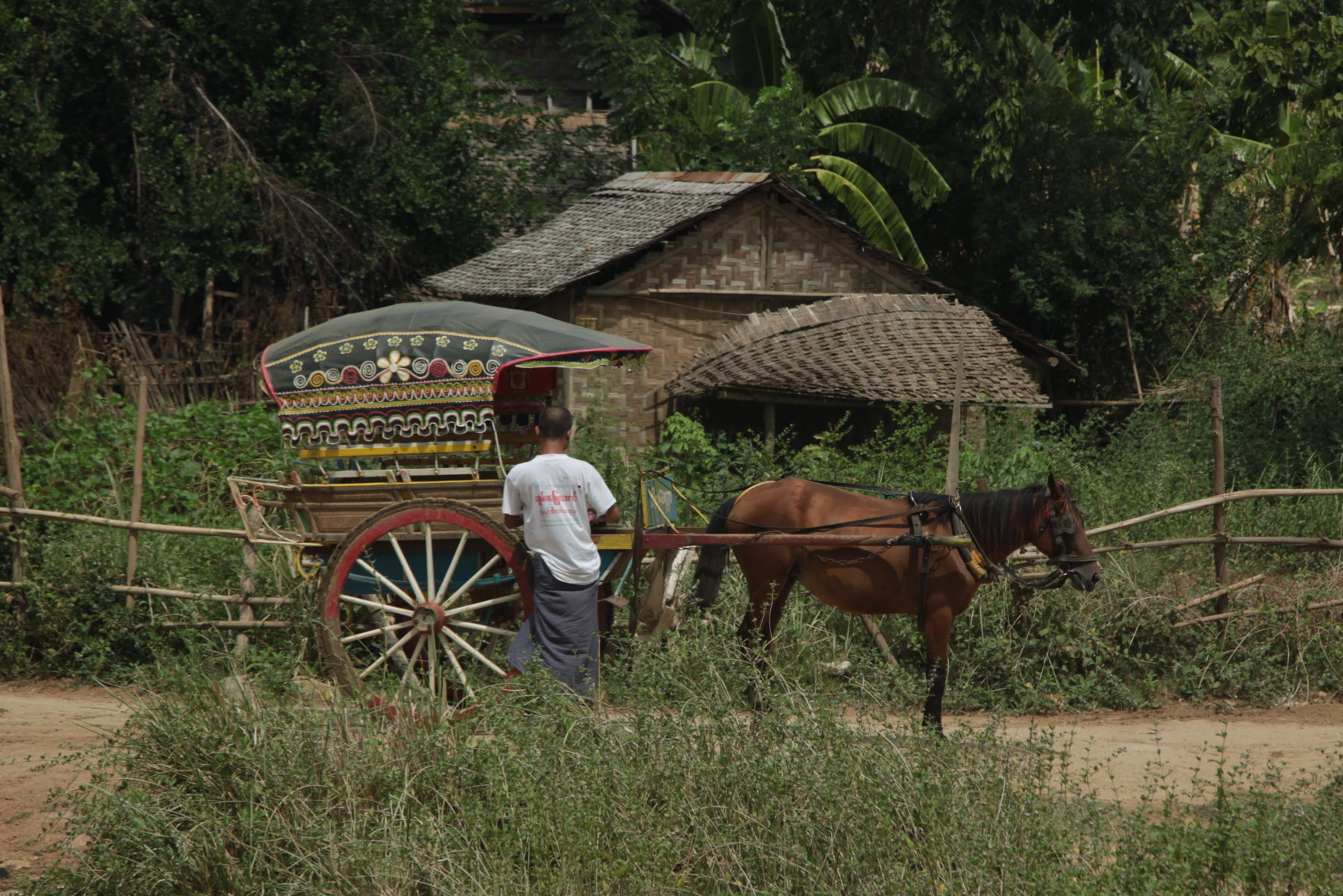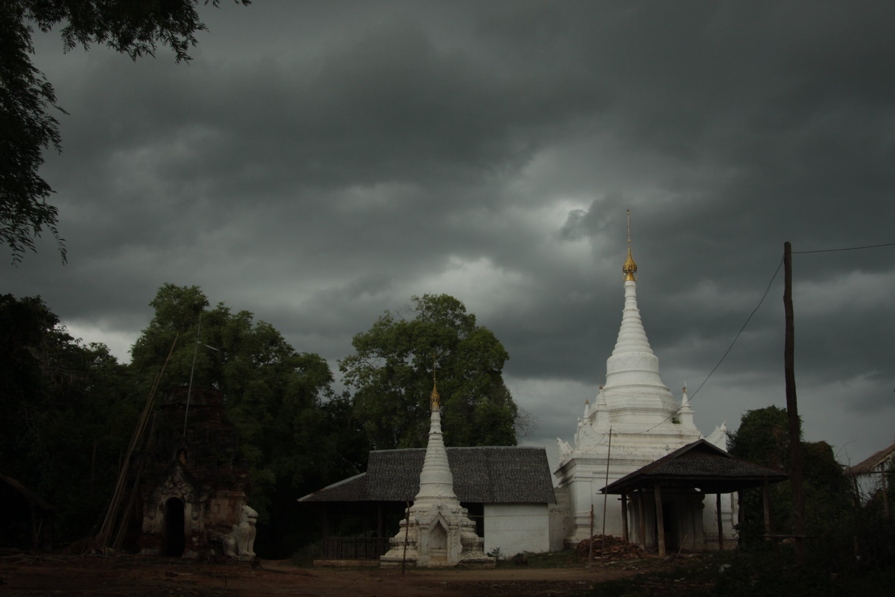 A curta travessia demorou menos de cinco minutos e na chegada, fomos completamente assediados por condutores de carroça, que queriam transportar-nos! Enquanto andávamos, eles seguiam-nos e não se calavam! Exasperante! Depois de dez minutos de martírio, já estava no meu limite de paciência e assim que vi uma brecha de oportunidade – uma ponte pedonal – afastei-me daqueles chaaaaaaaaaaaaaaaaaaaaatos! As raparigas seguiram-me os passos e sem fazermos ideia, esse foi o momento fulcral da nossa visita a Inwa. Logo de seguida, começámos a encontrar diferentes tipos de estupas e pagodas, construções antigas, até… os nossos olhos “colidaram” com a imagem de um grande templo amarelo “sujo”! Surreal! Espetacular… ficámos completamente fascinados e sem avistar vivalma, fomos deambulando pelo local. 😀 Daí, continuámos as explorações e vimos uma grande tempestade a aproximar-se, andámos livremente por campos de cultivo, vimos uma grande pagoda dourada, coqueiros e palmeiras, vacas, cavalos, camponeses, muralhas e uma torre a emergir do nada!