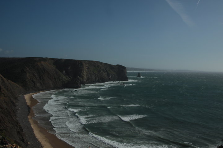 Na chegada, ao falar com uma residente sobre mercearias locais, percebi que na aldeia não existiam opções e que para me abastecer teria de regressar à urbanização do Vale da Telha, a cerca de três quilómetros de distância. Como a senhora estava de partida para esse local e talvez porque tenha percebido o meu cansaço e desapontamento, ofereceu-se para me transportar em ambos os sentidos. 🙂 Graças à sua graaaaaaaande ajuda, em vinte minutos resolvi a questão do abastecimento e novamente na aldeia, dirigi-me para a costa. Estava oficialmente na presença da bonita baía da Arrifana, das suas ondas constantes e das suas “focas” marinhas. 😛