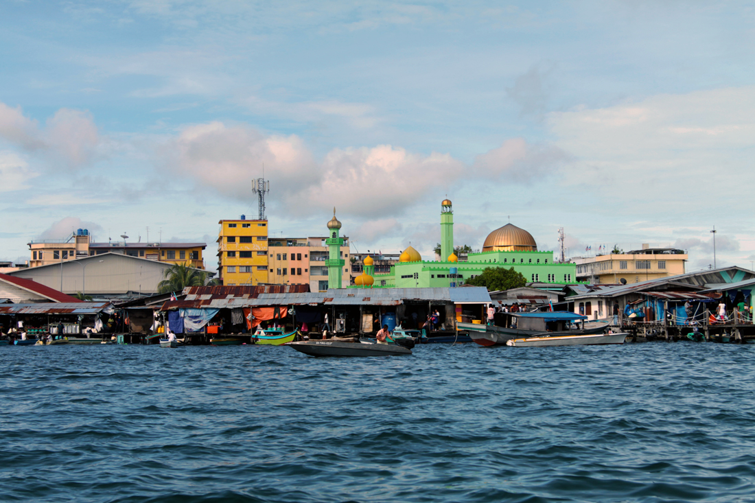 Semporna – pode encontrar mais aqui – revelou-se a cidade mais suja e deprimente que vi na vida… lixo espalhado pelo chão e pelas águas, crianças encardidas e descalças e um cheiro intenso a fruta em decomposição. O primeiro impacto, não foi de fácil digestão, porém com o passar dos dias deparei-me com sorridentes crianças, pessoas humildes mas simpáticas e afáveis, barcos coloridos, mercados de peixe e vísceras e uma bonita mesquita verde-alface… foi assim que a dignidade humana conferiu à cidade uma profundidade, que poucas vezes senti na vida.