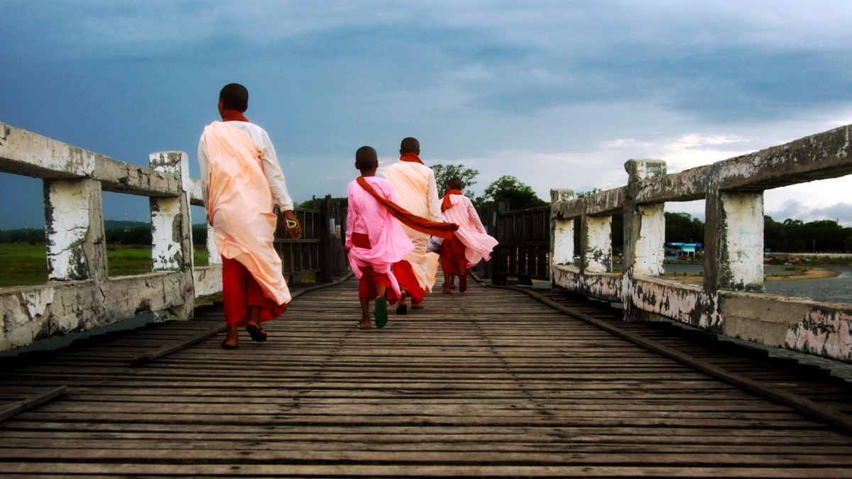 Depois da visita a Mandalay, havia que visitar os seus arredores, uma vez que estes estão repletos de locais de elevado interesse histórico e cultural. Amarapura, foi a primeira paragem e aí encontrámos centenas de monges em fila para almoçar. A disciplina, os rostos sóbrios, serenos e sorridentes – dos mais jovens -, os pés a caminhar, as vestes bordô, os turistas a tirar fotografias. Foi sem dúvida, um ritual interessante de observar. Daí, seguimos para a colina de Sagaing, onde encontrámos uma paisagem coberta de pagodas, florestas, campos de cultivo, rios, pontes. Em Inwa para além do “assédio” de condutores de carroça, que nos seguiam e matraqueavam sem cessar enquanto andávamos, pudemos encontrar diferentes tipos de estupas e pagodas, construções antigas, uma grande tempestade a aproximar-se, andámos livremente por campos de cultivo, vimos uma grande pagoda dourada, coqueiros e palmeiras, vacas, cavalos, camponeses, muralhas e uma torre a emergir do nada. O nosso destino final foi o lago de Taung Tha Man, onde ao final do dia, mas sem pôr do sol passeámos calmamente sobre a bonita ponte de madeira de U Bain, onde encontrámos uma serena paisagem e todas as pessoas que por lá circulavam, principalmente os monges de vestes esvoacentes. Esta foi a conclusão perfeita, para o tour nos arredores de Mandalay.
