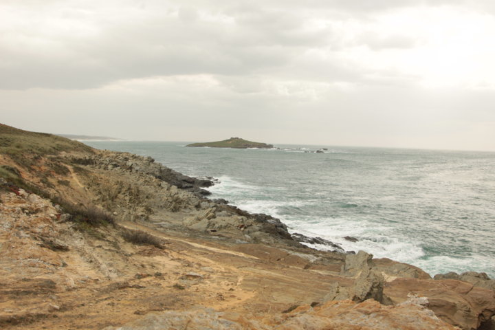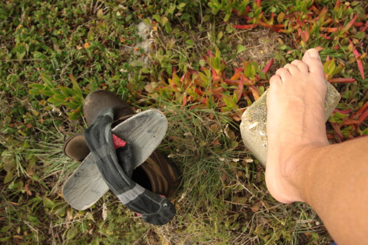 Com os pés completamente encharcados, segui colina acima e assim que encontrei um apoio, descalcei as botas, tirei-lhes a água do interior e espremi ao máximo as meias e as palmilhas. Uma vez que as botas estavam ensopadíssimas, decidi não calçar o par de meias extra que me restava e guardá-las para a noite – caro leitor, apesar de no momento esta me ter parecido uma decisão lógica, no presente posso claramente dizer, que este foi o meu primeiro grandeeeeee erro! – sem nada mais poder fazer, deixei de pensar neste molhado acontecimento e segui andando junto ao mar, no topo de pequenas arribas.