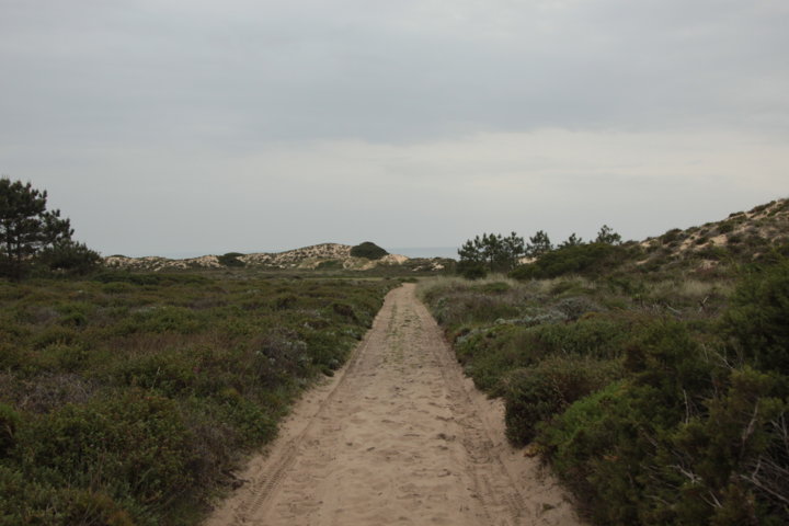 Para Norte, avistava-se a silhueta das feias torres da central termoelétrica de Sines, para Sul a ilha do Pessegueiro dominava a prateada e azulada paisagem, onde se viam outras pequenas ilhotas, a que os locais chamam palheirões. Porto Covo ia ficando para trás e quando cheguei ao início da praia da ilha, fruto da maré tive que atravessar outra zona repleta de água. Uma vez que já tinha as botas encharcadas, segui em frente sem grandes preocupações. Agora estava outra vez com os pés a boiar, mas continuei a andar – segundo grandeeeeeee erro! – em direção às praias do Queimado e dos Aivados. Nessa altura, o trilho que até aí estava muito bem marcado, desapareceu e tive de continuar por dunas junto às praias, até o caminho contornar as praias da Galé e do Malhão e o seus extensos cordões dunares. À medida que ia fletindo ligeiramente para o interior a paisagem de dunas e vegetação rasteira, mudou um pouco e nesse momento pude ver uma densidade de clorofila mais verde e colorida, e pinheiros em meu redor. 🙂