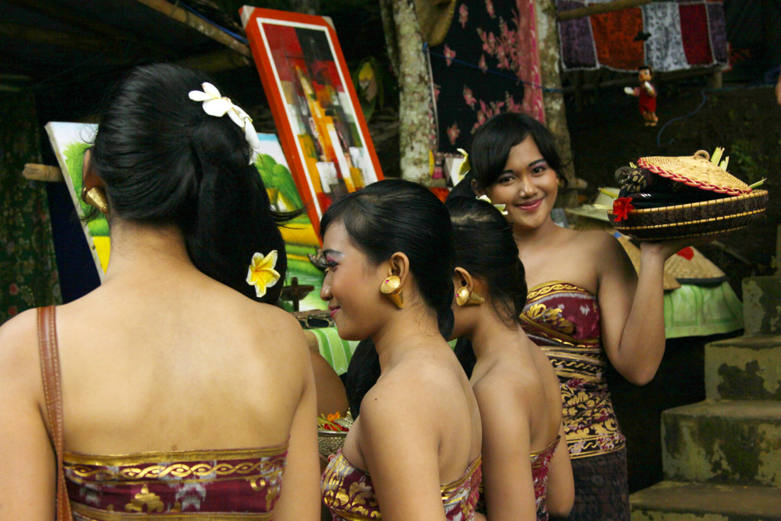 Em Ubud – pode encontrar mais aqui – que é considerado o centro espiritual de Bali, visitei o santuário sagrado da floresta dos macacos que está repleto de símios impertinentes e agressivos – como qualquer local da Ásia em que os macacos convivam com os turistas -, vi bonitos e serenos templos, lojas de artesanato – esculturas em pedra e madeira, pintura, mobiliário, decoração, quinquelharia – e os terraços de arroz que não se revelaram nada de extraordinário, mas nos quais tive a felicidade de observar uma cerimónia em que estudantes envergavam coloridos e tradicionais trajes balineses.