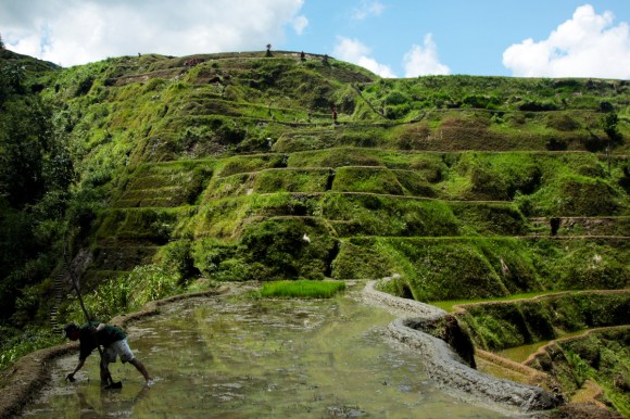 Do reino do culto dos mortos, parti bem cedinho para a cidade de Bontoc, onde rapidamente arranjei uma guesthouse. Resolvida a questão do poiso e do “monstrinho”, apanhei um jeepney montanha acima, até à aldeia de Maligcong que ficava apenas a cinco quilómetros de distância, mas que fruto da estrada muito esburacada e da topografia acidentada, demorou mais de meia hora a ser alcançada. Na aldeia, estive toda a manhã em deambulações e aí tive a oportunidade de observar pela primeira vez, e verdadeiramente uns terraços de arroz made in Filipinas. Na aldeia encontrei terraços muito verdes e simultaneamente, cheios de água e reflexos. A paisagem era muito tranquila, serena e harmoniosa, e para além de mim, só se viam camponeses nos seus afazeres: cortar ervas, reconstruir terraços com lama, plantar arroz…