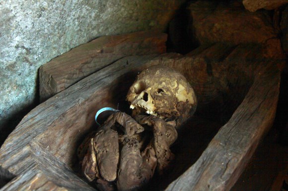O meu último destino, na RAC era Kabayan e as suas múmias. Desse modo, voltei a apanhar um autocarro em direção a Sagada, porém desta feita, apenas fiz uma hora e meia de viagem, e numa interseção com a estrada principal, fui deixado pelo prestável motorista. De monstrinho às costas e sempre a subir em rampas muito inclinadas, andei durante meia hora! Até decidir que se continuasse naquele ritmo não iria conseguir chegar às grutas de Kabayan que ficavam a mais de cinco quilómetros da estrada principal. Quando encontrei uma casa perdida naquela paisagem montanhosa, pedi aos seus donos para me guardarem a mochila e bem mais leve continuei a andar. Passados poucos minutos, passou uma carrinha amarela a quem pedi boleia e a bordo deparei-me com um grupo de montanhistas filipinos que iam para o mesmo destino! Perfeito! Foi deste modo, que visita às múmias de Kabayan, foi realizada na companhia de um alegre grupo. Acompanhados de um nativo que protege o local, percorremos um curto e agradável trilho no meio de um pinhal, e numas pequenas grutas com portas fechadas a cadeado, que foram abertas para nós, encontrámos no interior de pequenos caixões, múmias em posição fetal – crença de voltarem à barriga materna. Foi com eles que voltei a Baguio, ainda parando durante a viagem para almoçar, sendo à mesa e com gastronomia tradicional filipina que terminei a minha visita à RAC.