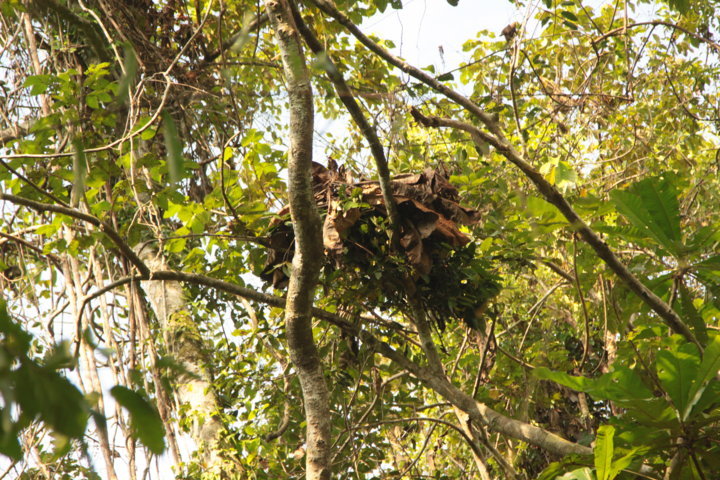 Às 8.40 já estávamos no Campo 2 e passados quinze minutos na zona da plataforma. Neste dia tivemos muita sorte, pois vimos muita ação e interação! 😀 Um macho com vinte anos, bastante corpulento e com a cara mais gorda e chapada – efeito da testosterona nos machos dominantes; uma fêmea acompanhada da sua cria (já maiorzita) e o seu comportamento para afastar o grande macho da comida – partir galhos e atirá-los, fazer barulho, mostrar-se “furiosa”; o transporte do leite para o topo de uma árvore – tentativa de dar de beber à cria); e finalmente um segundo macho também apareceu na plataforma. Depois de tanta ação, entrámos na floresta para continuar a seguir esta “algazarra”, um ambiente tal como dia anterior, totalmente National Geographic. 😀