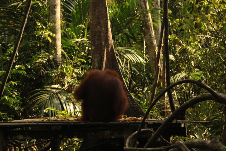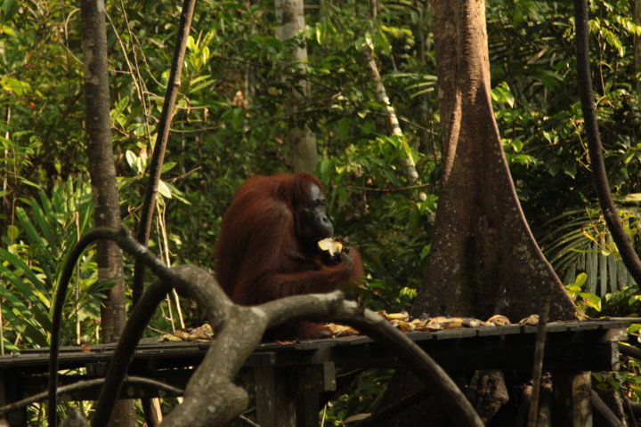 Por volta das 11.30 estávamos de regresso ao barco e a deliciar-nos com o almoço. Depois de mais uns momentos de conversa com o nosso guia voltámos a partir para Camp Leakey, desta feita rumo à plataforma onde alimentam os orangotangos. Mas antes, fomos recebidos por macacos de cauda longa, estivemos no centro de visitantes, vimos uma fêmea orangotango a repousar e percorremos mais um trilho alternativo. Quando chegámos à zona da plataforma, a área envolvente já estava semi preenchida com turistas e passados poucos segundos pude observar o meu primeiro gibão! 😀 (cara cómica; corpo desproporcionado – braços muito longos; veloz como uma bala) e esse foi o único primata que vimos no local. Enquanto esperávamos, o céu foi ficando carregado, carregado e passado uns minutos começou a chover. Toda a gente partiu, mas nós ficámos e nessa altura fui até à plataforma comer uma banana e declarar-me “rei” de Camp Leakey – uma vez que o meu “oponente” não apareceu! 😛