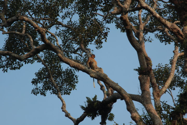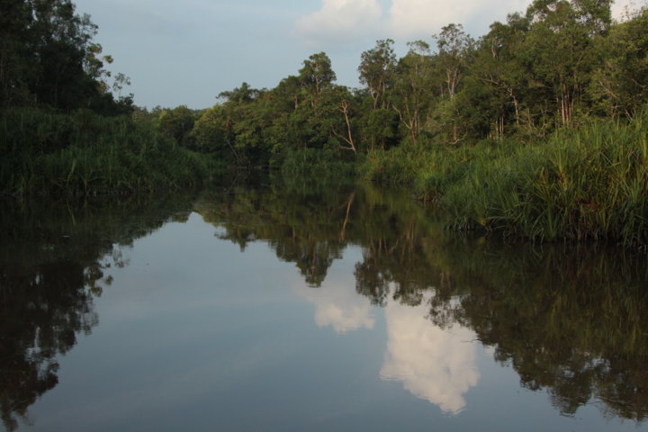 Às 5.30 já estava acordado, depois de dormir poucas horas mas bem “ferradas”! E tive a oportunidade de ver o dia a clarear, a neblina matinal, o céu prateado. O pequeno almoço iniciou-se à mesa e terminou na proa, em observações zoológicas. No caminho para o campo Leakey (o local de observação de orangotangos mais interior de todo o parque natural), como “prometido” fomos encontrando bastantes espécies de pássaros e alguns macacos, e vimos a água do rio a transitar de uma cor castanha e barrenta para o negro, como se tratasse do sangue da Terra. Este fenómeno ocorre, devido às raízes das árvores e à ausência total de poluição, e este é um dos dois únicos locais do mundo, onde ocorre.