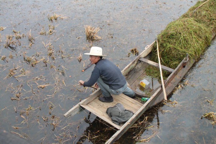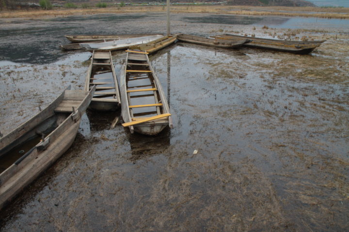 Partímos então em direção a Zhawoluo e durante a curta viagem vi uma zona do lago de águas mais paradas e rasas, que davam a noção da existência de pequenas ilhas. Quando chegámos à aldeia, esta era completamente dominada pelo turismo: passeios a cavalo e de pónei, vendedores de postais e de imitações baratas de artesanato, bancas de comida com preços inflacionadíssimos, enfim nada de interessante. Porém e felizmente, bastava sairmos vinte/trinta metros do trilho para observar uma face mais rural com campos de cultivo, barcos a recolher vegetação, árvores, flores delicadas e camponeses nos seus afazeres. 🙂 No final da aldeia cruzámos a ponte do matrimónio e na outra margem do lago voltámos a dar de caras com bancas de comida, desta feita com “manjares” exóticos, sendo o sapo – pronto para virar churrasco – uma das iguarias. 😛
