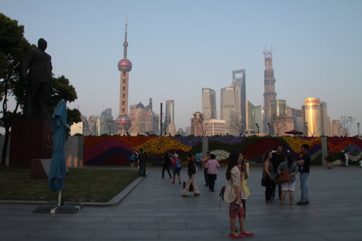 Antes de começar a deambular no passadiço e ainda com os olhos no horizonte, vi uma estátua imponente de alguém que me parecia o Mao e instantaneamente pensei: ”F@£$-&%, até aqui?! Mas o que é que esta múmia tem a ver com a cidade, ou qual o seu mérito na construção desta China capitalista e vibrante?”. Uns metros mais à frente e depois de ler a placa comemorativa da mesma fiquei muito mais “aliviado”, pois a estátua nada tinha a ver com Mao, era sim de Chen Yi, o primeiro presidente da cidade, após o advento comunista de 1949.