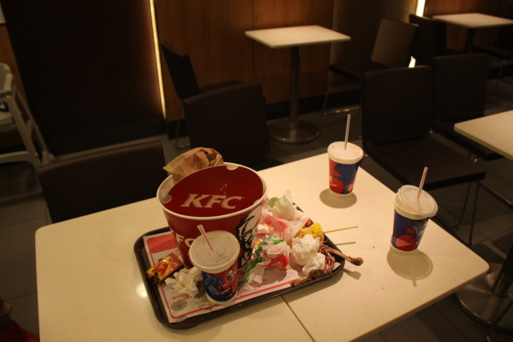 Quando apanhámos o autocarro, paguei-lhes os bilhetes e quando saímos no centro da cidade, começámos à procura de um local para jantar. Porém e apenas trinta minutos depois, eles realmente perceberam a minha intenção de lhes pagar o jantar, e acabaram por escolher que jantaríamos no KFC… É caricato. É preciso vir à China e avariar-me o PC para comer aí! 😉 De qualquer modo, o repasto consistiu obviamente em frango (frango frito e hambúrguers de frango), com coca-colas a acompanhar e o meu plano só foi parcialmente cumprido, pois o “mini-génio” – nome pelo qual batizei o meu salvador – quis pagar os hambúrguers. Quando saímos do KFC, começámos a dirigir-nos para um bar para bebermos umas cervejas e nesse momento não senti o cartão MB – que tinha utilizado horas antes. Ainda fiz uma tentativa ténue para lhes explicar o sucedido, mas como continuaram a andar e eu não tinha a certeza absoluta de o ter perdido, acabei por guardar o assunto para mim e tentei não me preocupar demasiado.