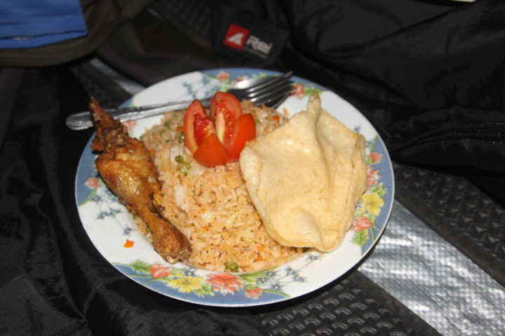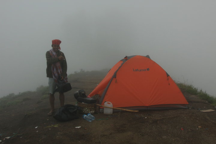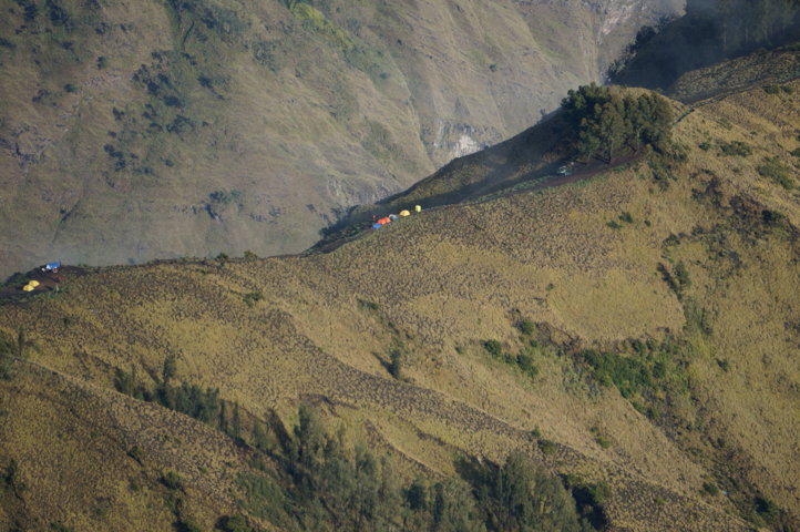 Quando cheguei ao local do acampamento – 2639 m -, estava um nevoeiro cerradíssimo e a visibilidade era praticamente nula, porém e passados alguns minutos, quando o grupo se voltou a reunir as nuvens e a neblina já tinham desaparecido parcialmente e podemos ver pela primeira vez o altivo Rinjani. As diferentes cores: os múltiplos castanhos, amarelos e verdes, as nuvens a correrem velozmente no céu, o vale a nossos pés e o pico formavam uma “sinfonia” bela! E esta paisagem e um jantar delicioso de frango e arroz fritos, aconchegaram o corpo e a alma para “algo” que estava ao virar da esquina…