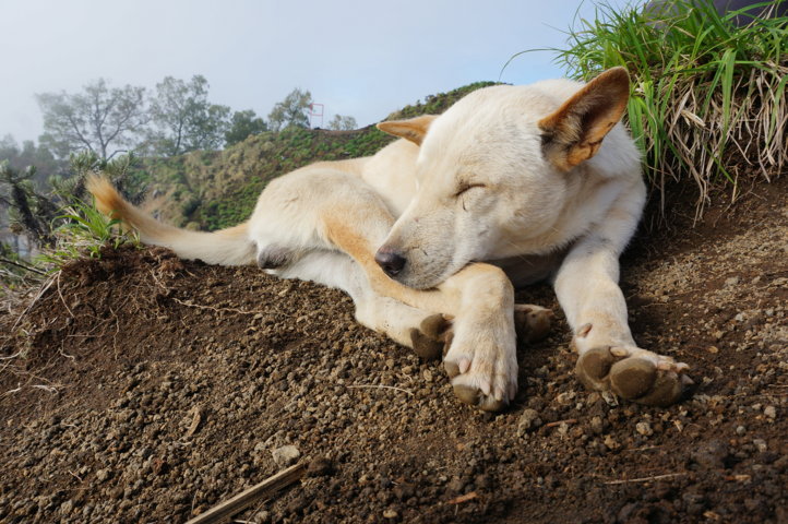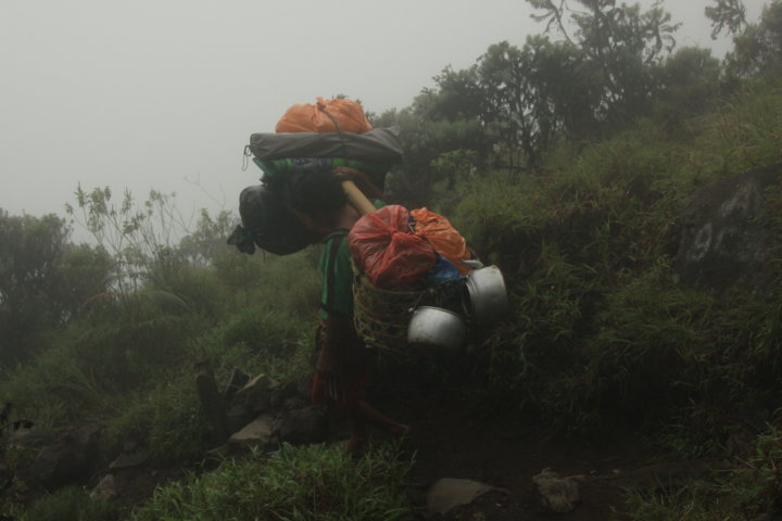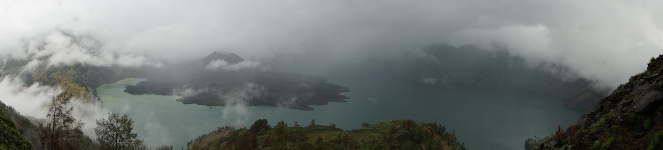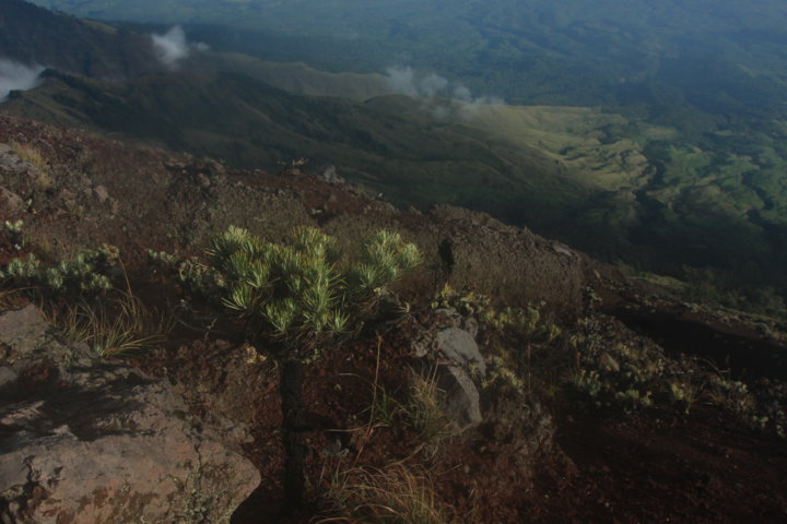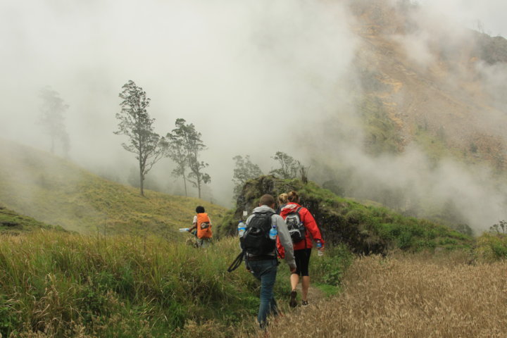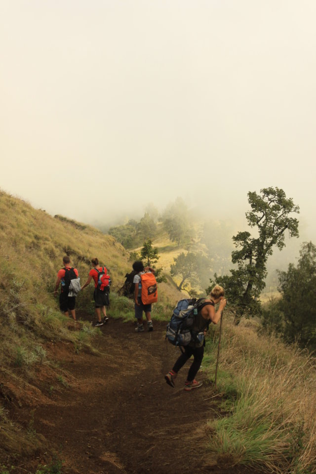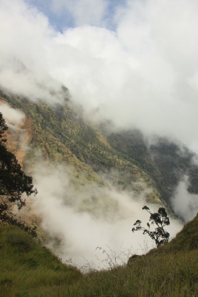 A viagem encosta abaixa levou-nos até ao Danau Segara Anak, que está à cota dos 2000 m e durante o trajeto, que durou sensivelmente três horas, vimos os nossos carregadores quase a “correrem” encosta abaixo de flip-flops nos pés – impressionante! – e penetrámos num mundo de nevoeiro e neblina, encostas pedregosas e escorregadias, árvores e erva verde.