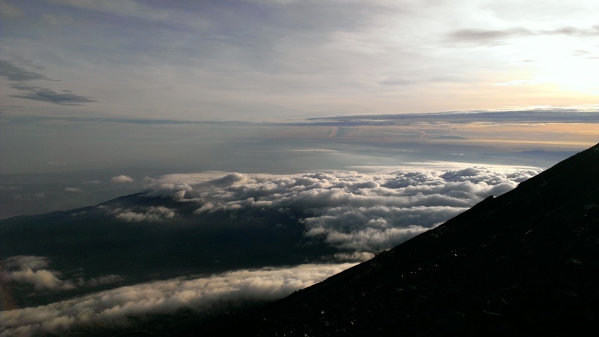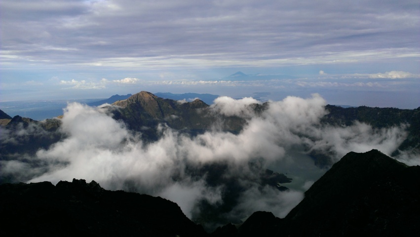 Já todos juntos e em rota descendente, o Rinjani começou a revelar toda a sua beleza e eu tive a felicidade e o privilégio de presenciar uma das paisagens mais fascinantes e encantadoras da minha vida! O sol surgiu aos poucos e foi iluminando progressivamente, vales, montanhas, a cratera, o lago e o oceano; as nuvens que corriam no céu, formavam-se e dissipavam-se, e eram ora fiapos, ora camadas densas de “algodão doce; as cores mudavam de intensidade a cada instante fruto da luz que se intensificava e a paisagem era uma paleta rica: os negros e ocres na cratera; múltiplos azuis no lago, no oceano e no céu; branco e cinzas nas nuvens; verdes e castanhos nas florestas, vales, árvores, vegetação e montanhas.