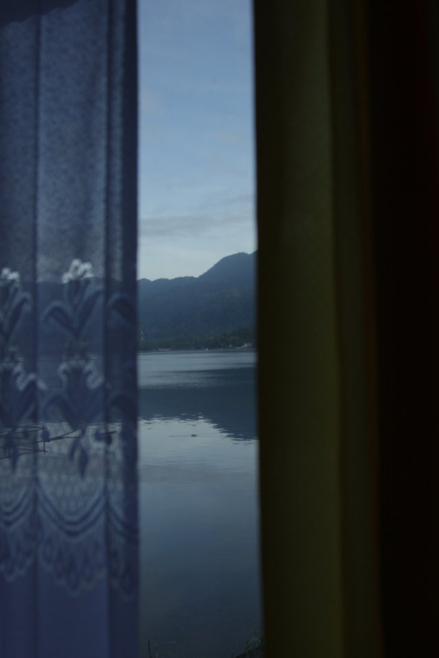Depois de almoçarmos e de falarmos com o dono de um pequeno restaurante, arranjámos já na saída da vila e junto ao lago um “chalé” com janelas a toda a volta e que antes de abrirmos as janelas, cheirava ligeiramente a mijo de gato. Perfeito, ou quase! 😛 Da nossa varanda, a paisagem era de facto bela, nuvens cinzentas muitas espessas e o lago com uma cor verde azeitona profunda.