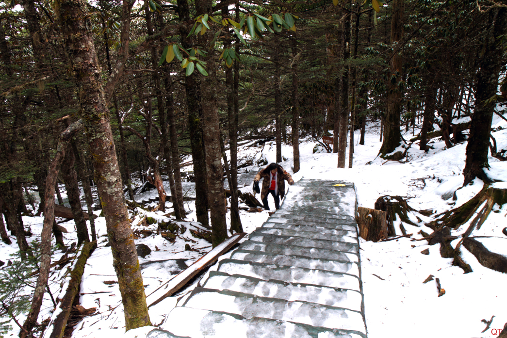 Na ascensão até ao topo da montanha Emei, a minha estreia acima dos três mil metros, o nevoeiro foi uma constante e na descida houve um encontro do “décimo segundo” grau com macacos agressivos. Na fotografia pode observar-se o templo existente no Jin Ding – Pico Dourado – envolto num manto branco – pode encontrar mais aqui.