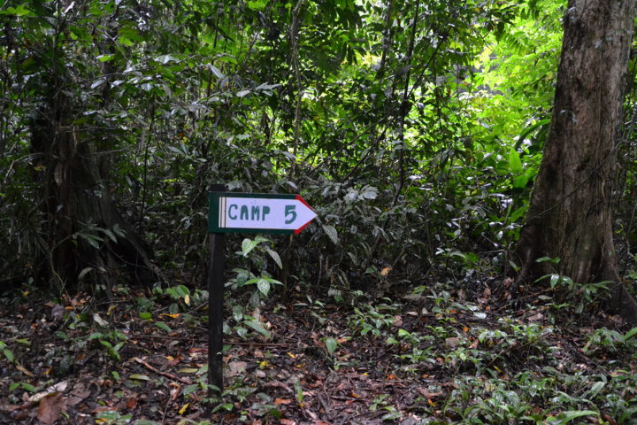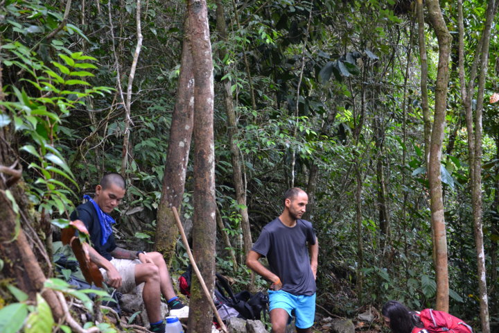 Na despedida dos barcos e antes de começarmos a caminhada para o campo 5 já estávamos completamente encharcados, pois o que o rio não molhou a chuva terminou o “serviço” e durante pelo menos metade dos dez quilómetros, choveu com uma intensidade brutal! A ponto do meu único objetivo ser: andar, andar…andar. A certa altura da caminhada, tive de parar para pôr umas meias, pois os famosos sapatos de borracha estavam a começar a ferir-me o peito do pé.