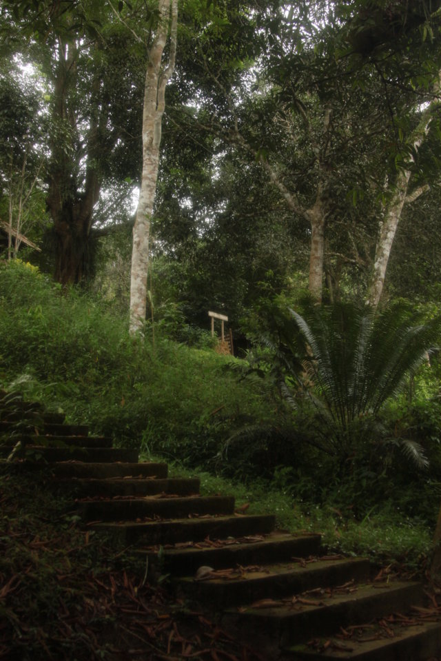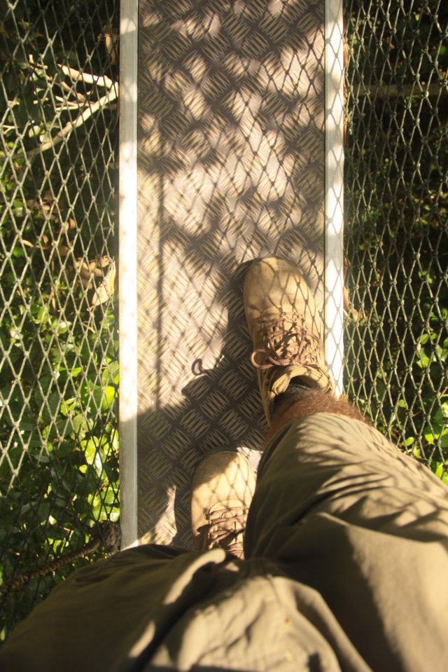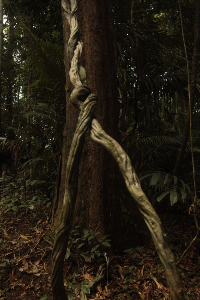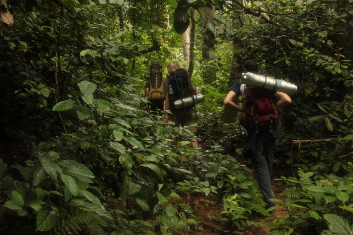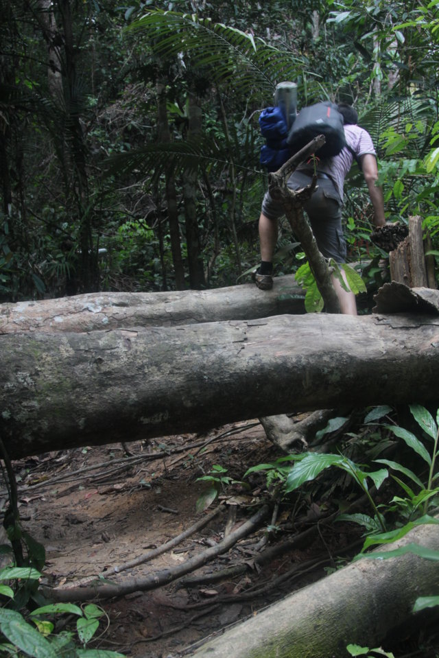 Antes de começar a andar e por instinto decidi olhar para a bússola. Assim que fiz a travessia, comecei imediatamente a subir por um caminho enlameado e que me parecia bem marcado. Trilho abaixo, trilho acima fui penetrando na selva e comecei a suar abundantemente fruto da elevadíssima humidade e do esforço físico associado a caminhar num terreno tão acidentado. Numa passagem mais enlameada escorreguei e vi a minha garrafa de água rolar vinte metros colina abaixo, ficando numa zona cheia de vegetação.