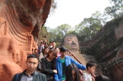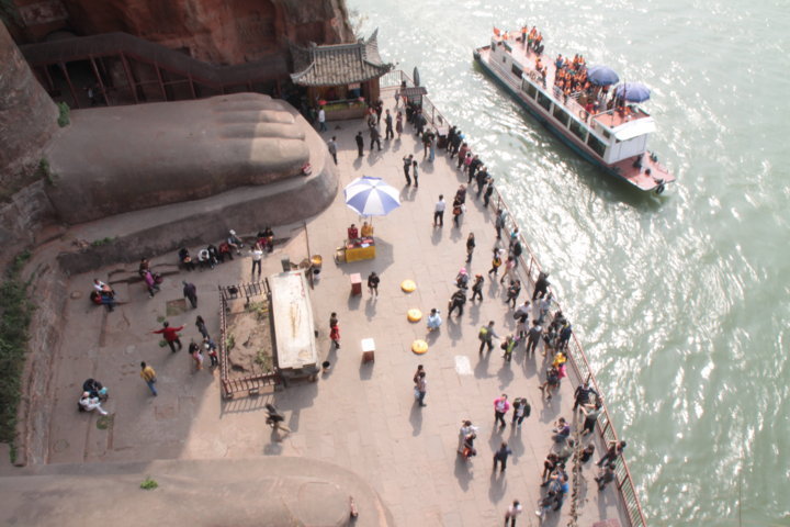 Junto com as multidões chinesas, descemos um penhasco de rocha laranja, abrupta e parcialmente esculpida com relevos, nichos e aberturas e que à distância parece uma aldeia. Observámos o rio verde que corre aos pés do Buda e onde circulam freneticamente barcos turísticos que permitem uma vista frontal do local. E na descida o Buda de Leshan revela-se e agiganta-se. Com setenta e um metros de altura e pontuado pela vegetação que cresce no seu colo, ombros e corpo, como que das suas vestes se tratasse, o grandioso buda molda-se na rocha que lhe dá vida. Quando chegamos à base da estátua, o Buda imponente toma conta de todo o espaço, só temos olhos para a sua dimensão e verificamos que somos mais pequenos que o seu dedo mindinho. É aqui, que sentimos realmente o Buda de Leshan. 🙂